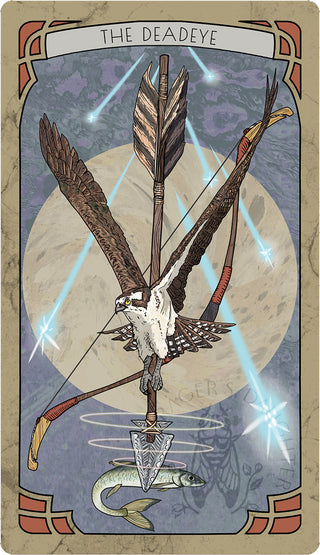 An intimidating figure, an osprey hovers aloft while clutching an arrow in its talons, wings impressively displayed. A bow is situated behind while shooting stars careen down from the heavens. The raptor’s piercing gaze stares dead ahead, locked solemnly on his target. He won’t be distracted by the spectacle above.