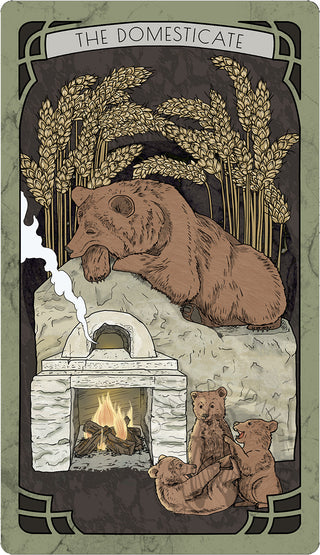 A mother brown bear warms herself while snoozing atop a masoned hearth. Hunks of split burl roast in its stone firebox, readying the oven for baking. Her cubs tangle playfully into knots under a backdrop of ample golden wheat.
