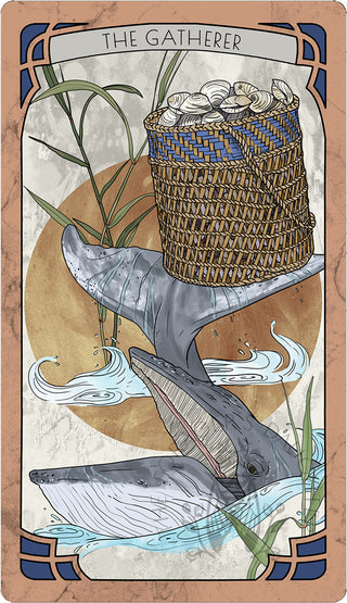 A massive baleen whale careens across cerulean ocean waters. Its herculean figure is nearly dwarfed by the gift it totes aloft with its tail. An ample cane reed woven basket teeters there, nearly overflowing with a bounty of clams gathered from the sea floor. It is the plenty of a proper haul.