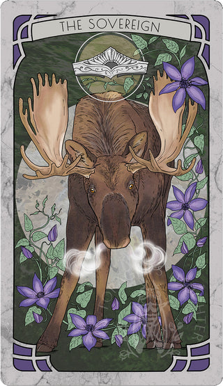 A silver circlet, adorned with the emblem of a keystoned arch, floats majestically above the velveted barbs of a bull moose’s antlers. He’s a brawny giant who haunts his domain, wandering about it wreathed in elegant tendrils of clematis. A puff of steam exudes vim and vigor.