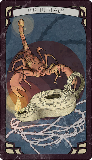 A scorpion poised to strike waits amidst a backdrop of shadow, warding off predators and usurpers that would dare cross into her territory. A clay lamp, encircled by a snare of thorns, illuminates her while casting away the darkness.