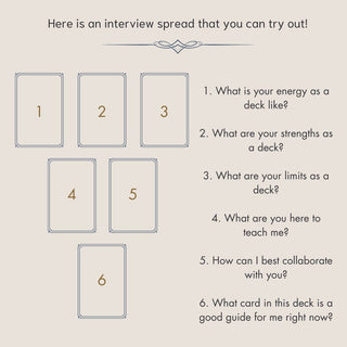 Another way to get familiar with your deck is to do an interview spread. This is a tarot spread with questions designed to illuminate that particular deck’s strengths, weaknesses, and style of reading. I do believe that, because of the range of artwork and types of decks, each can have different ‘personalities’. Some are very gentle, others are much more direct in their messages.