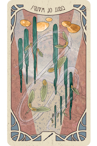 The Eight of Wands reversed can signal that patience in the face of delays and unexpected complications may be the best course of action. It may also indicate that you’re attempting to push through a project or force a solution too quickly without considering nuance and trajectory. Take a moment to stop, breathe, and reassess the direction you’re going.