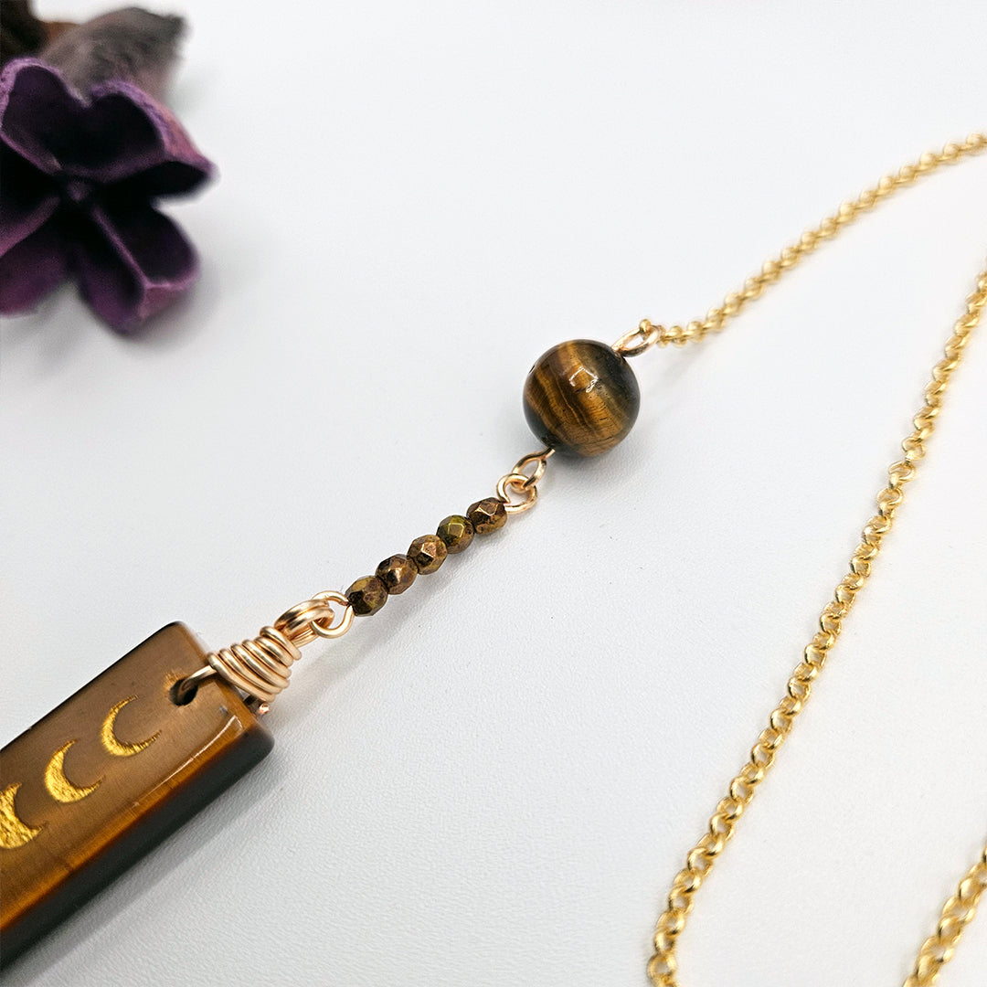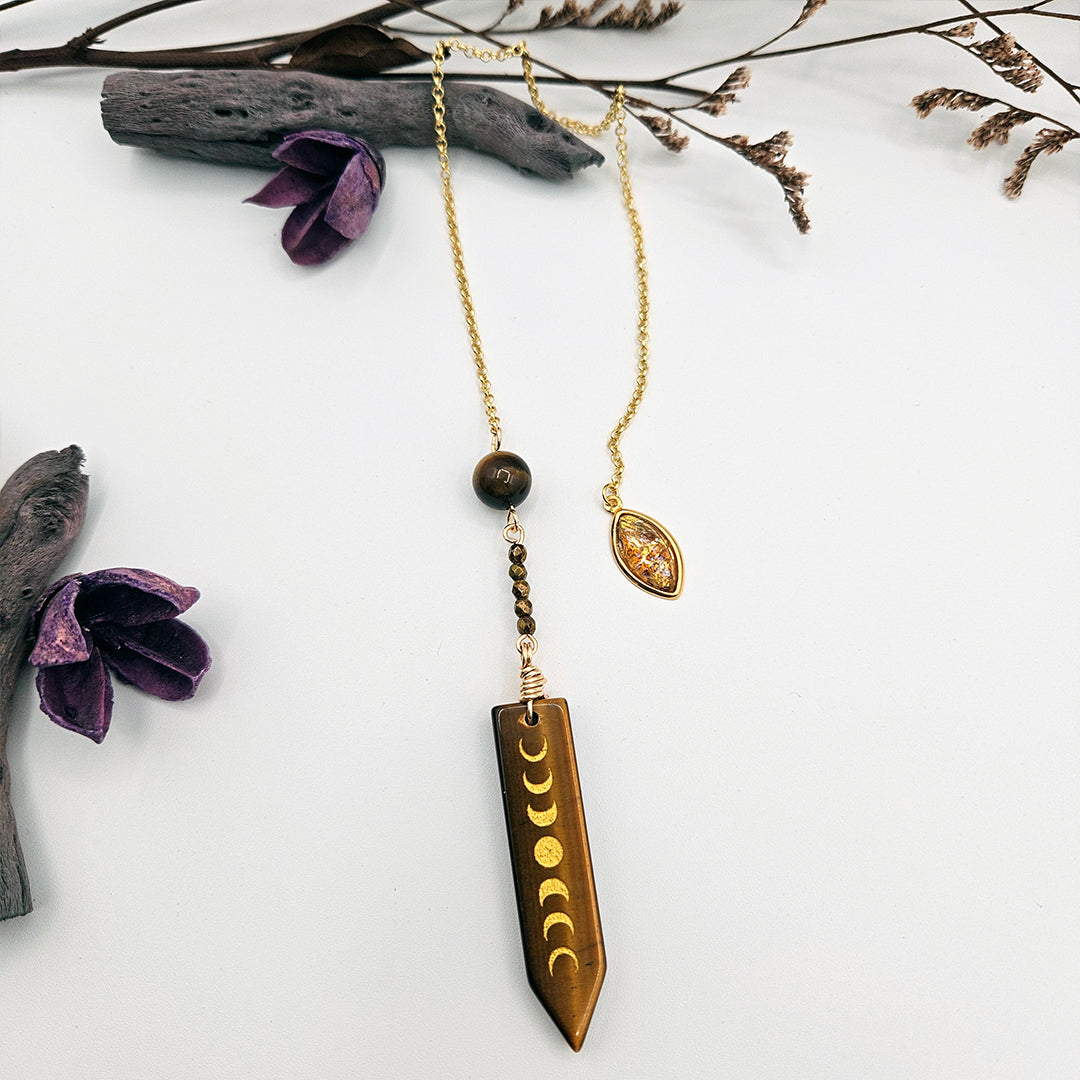 This pendulum features a polished tiger’s eye pendant engraved with the moon phases, linking personal empowerment to the cycles of growth and renewal. The 12-inch gold-plated chain is finished with a vintage crystal end piece and matching accent beads, making this a special, unique piece.